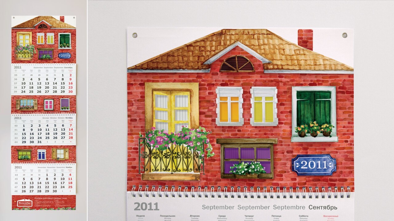 ИДЕЯ: Новый год — это праздник, который сближает людей. Мы решили подарить друзьям компании новогоднее поздравление, которое объединит их и при этом сможет стать персональным пожеланием для каждого адресата. Фирменный знак компании навеял образ открытки в виде большого дома, в котором живут самые разные люди, а на окошках есть самые разные жалюзи. А вытянутая форма квартального календаря подсказала ассоциацию с многоэтажным жилым домом, где под одной крышей живут люди, непохожие друг на друга.