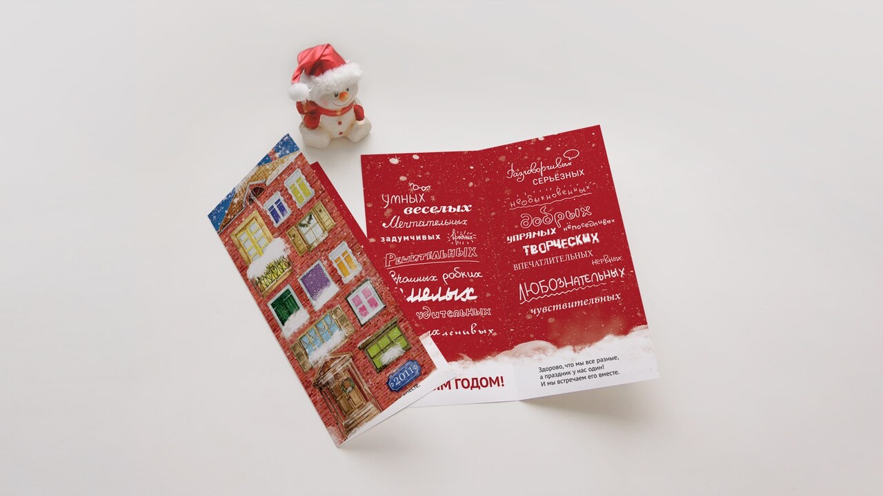 РЕШЕНИЕ: Идея вдохновила дизайнеров на акварельные, «ручные» иллюстрации, наполненные любовью, вниманием и множеством разных окошек. Фирменный красный цвет, запечатленный в кирпичной кладке, лёгкая заснеженность, мягкий свет из окон не только представляют в выигрышном свете продукцию компании, но и создают новогоднюю атмосферу и душевное настроение. Сказочно–уютный дух поддерживают декоративные изящные и озорные шрифтовые начертания под стать каждому из характеров клиентов. Благо у компании «ЖалюзиТорг» найдутся жалюзи для самых разных окон и людей!
