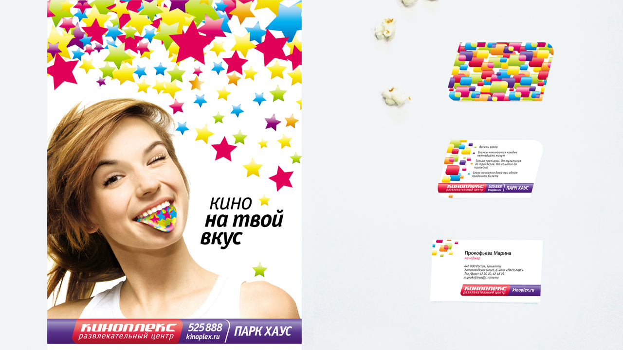 РЕШЕНИЕ: Киноплекс — это кино! Кино — это множество чувств, это тысячи эмоций, это яркие переживания, это буйство красок, это бесконечное число сюжетов и бегущих перед глазами кадров. Каждый жанр вызывает схожие у большинства зрителей эмоции, имея свой ВКУС. Показать эту многоликость кино и его восприятия можно, используя базовый элемент и цвета, яркие и свежие, соответствующие духу кино. Киноплекс — это «кино на твой вкус».