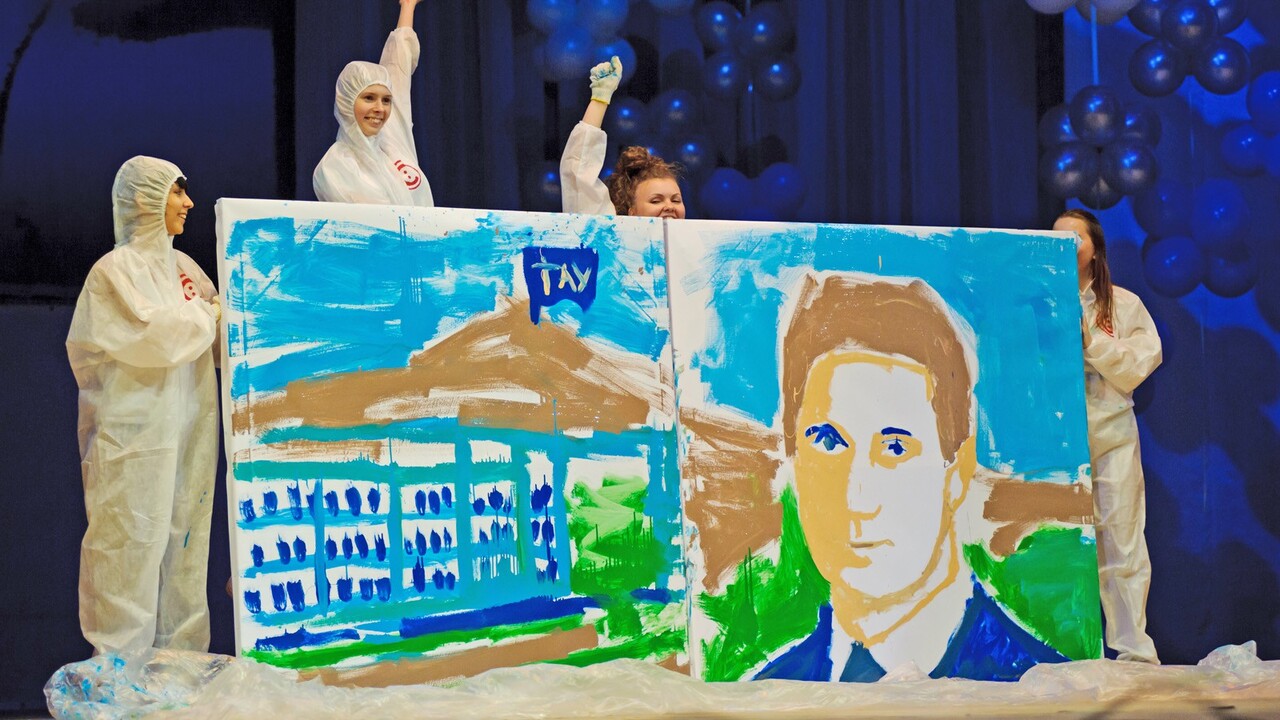 ВОПЛОЩЕНИЕ: Многочасовой просмотр аналогов скоростной перевёрнутой живописи и ежедневные тренировки в офисе дали свои положительные результаты: за 7 минут нам удалось создать интригующую атмосферу, опустить парашют из целлофана и нарисовать на двух полутораметровых полотнах здание Академии и портрет президента. Данный проект в очередной раз позволил понять, насколько сильно идея зависит от реализации. Транспортировка досок, сколачивание деревянных рам, натяжение и закрепление баннерной ткани, как ни крути, являются полноправными участниками процесса воплощения идей.
