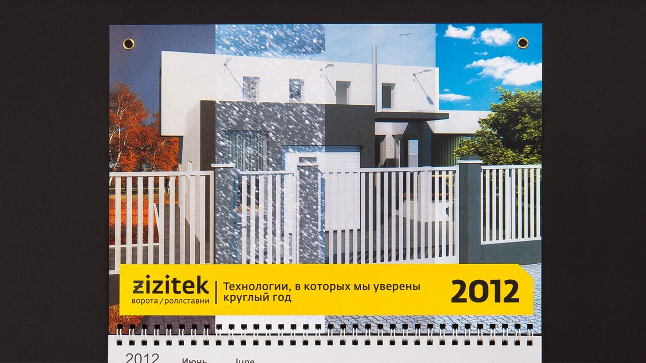 РЕШЕНИЕ: Плашка фирменного яркого желтого цвета в верхней и нижней части календаря удерживает первый взгляд смотрящего и сообщает всю необходимую информацию о компании, её специализации, вплоть до кредо: «технологии, в которых мы уверены круглый год». На верхней «визитной» части календаря разместилось изображение технологичного дома с современными воротами, установкой которых занимается «Zizitek».