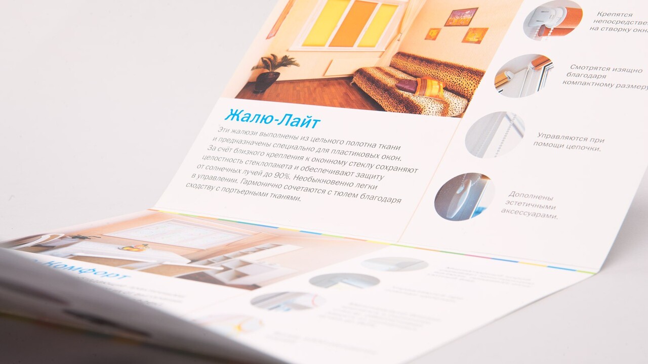 РЕШЕНИЕ: Насыщенные яркие фирменные цвета компании растворяются в мягких пастельных оттенках буклета. На обложку вынесена концепция одного окна, поделённого на секторы и меняющегося до неузнаваемости в зависимости от выбранного типа жалюзи. Масштабная концепция переросла в фотосессию-эксперимент. Одна и та же комната сочеталась с разными типами жалюзи и на глазах менялась в зависимости от окружающих предметов интерьера. Буклет с двумя сгибами раскладывается как картонный домик и демонстрирует результат фотосъёмки: четыре варианта оформления комнаты с разными солнцезащитными системами и сопутствующей обстановкой. Жалюзи уютно ощущают себя в любом интерьере, а также в благородном глянце приятной, шелковистой на ощупь ламинированной бумаги. Текстовые выноски помогают читателю, расставляя важные акценты в технических особенностях каждой конструкции.