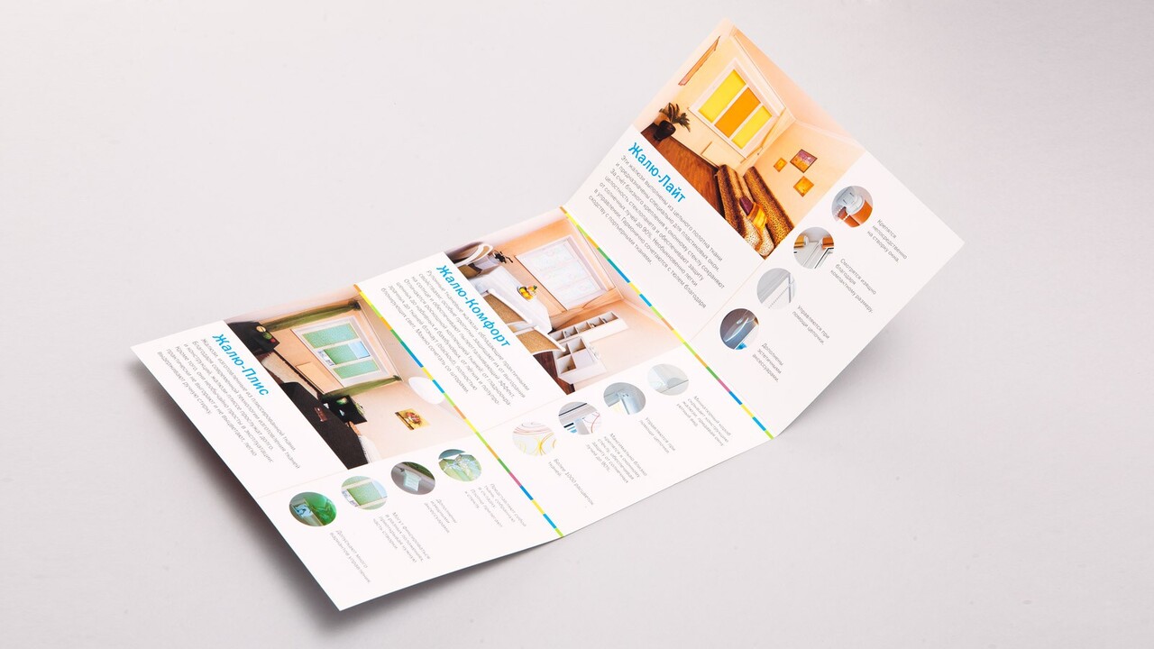 ЗАДАЧА: Разработать дизайн буклета, представляющего четыре типа продукции компании «Жалюзинск». Буклет должен выглядеть стильно, быть лёгким и прикладным.