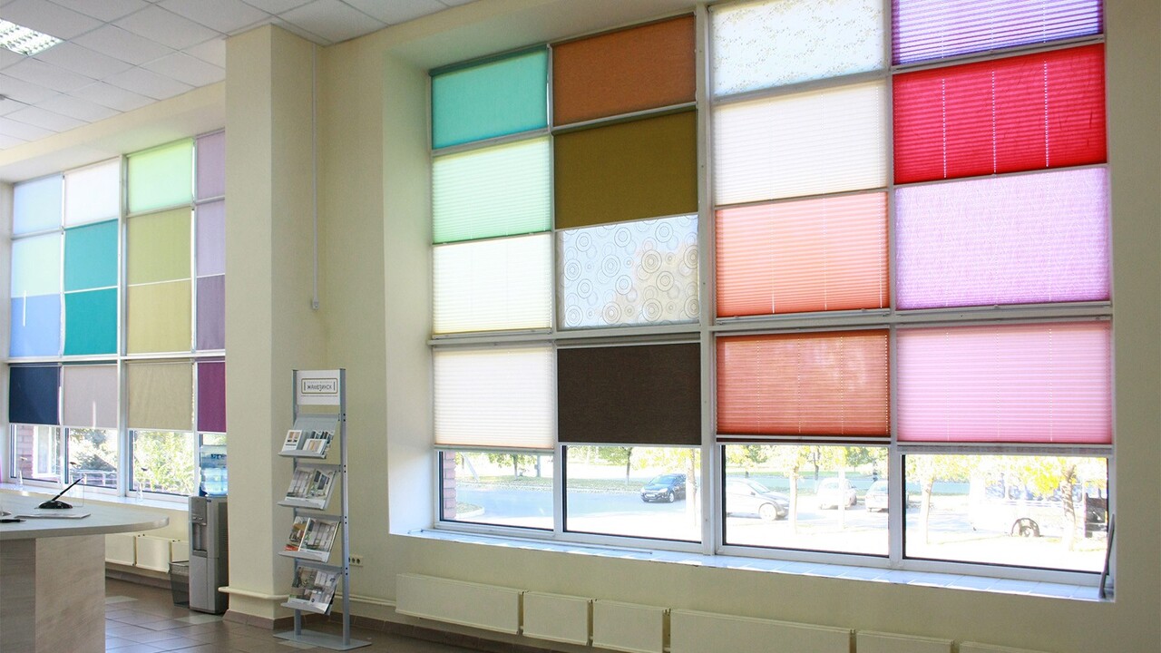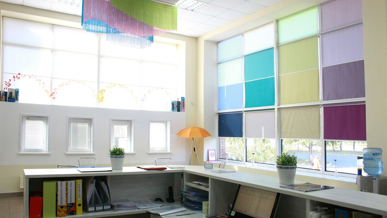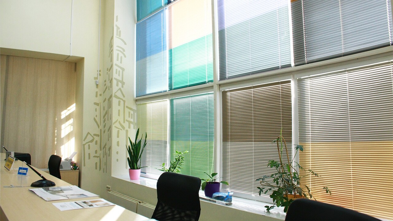 Отличительная черта офисного пространства – большие окна с перегородками, в которые встроен весь цветовой и функциональный спектр жалюзи.