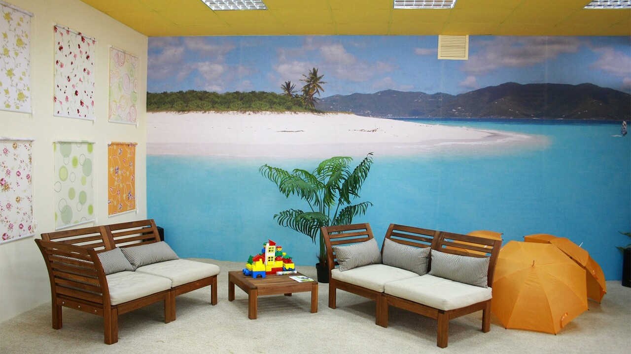 Северная сторона с завораживающим северным сиянием под потолком и западная сторона – рабочие деловые зоны для оформления заказов – символизируют холодную голову и чистый разум, которые так необходимы для принятия интерьерных решений. Южная курортная зона с шезлонгом и живописным фото побережья превратилась в пространство для отдыха и детских игр. А восточная зона, в которую покупатели попадают при входе в Жалюзинск и выходе из него, раскрашена яркими пряными расцветками жалюзи, призванными утвердить покупателя в правильности выбора солнцезащитной системы.