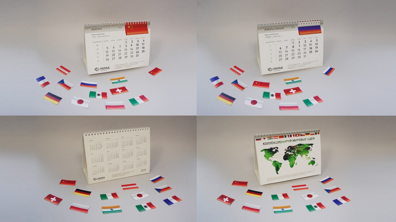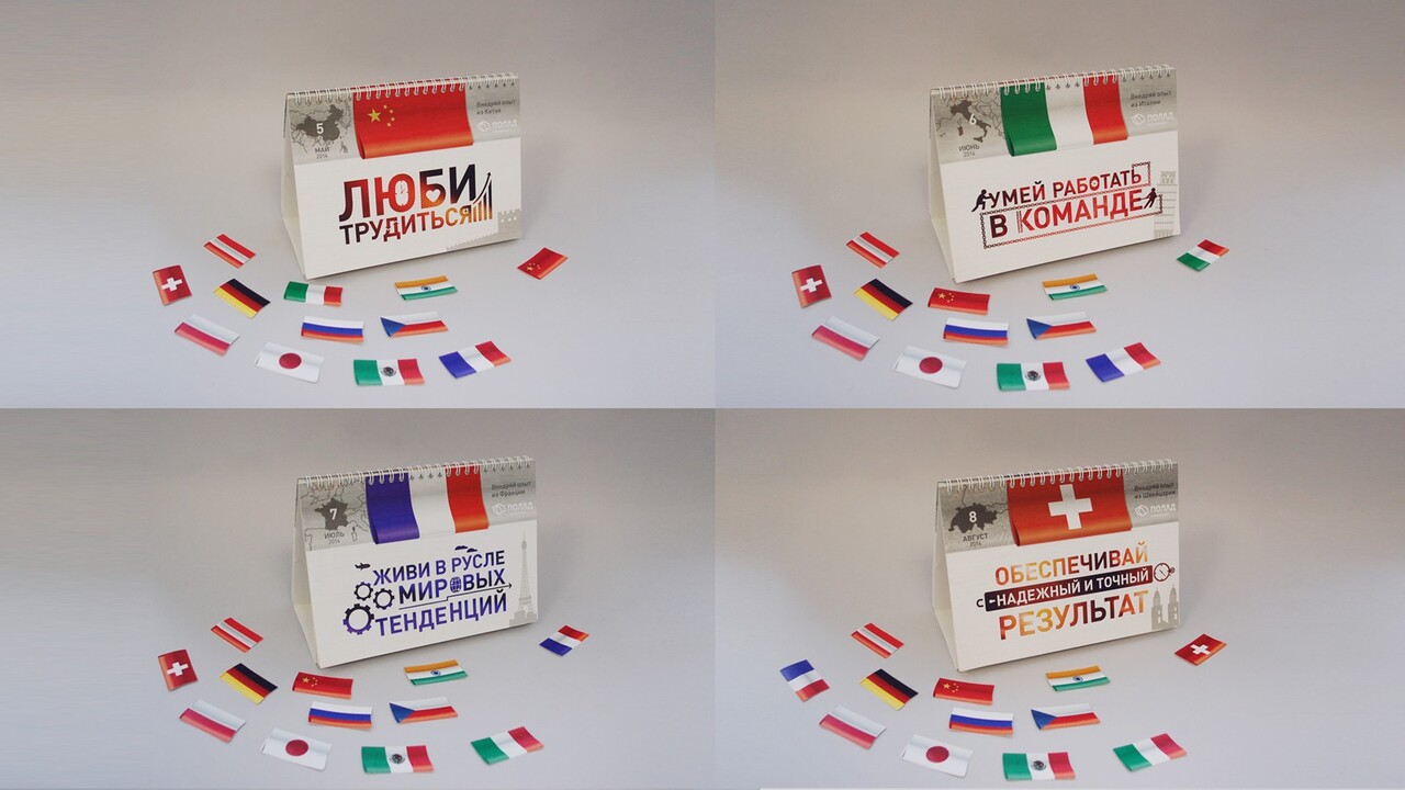 РЕШЕНИЕ: Компания постигает тонкую науку искусства управления и рассказывает об уже обретенном опыте. Географическо-культурный календарь каждый месяц повествует о конкретной стране, характере её жителей и тому, как этот характер помогает решать бизнес-задачи. Кастинг принципов и методик осуществлялся со всей строгостью, а их лаконичность не менее тщательно оттачивалась, для слоганов-фраз. Принципы менеджмента сформулированы как профессиональный кодекс и задачи сотрудника «Полад». Концепция развивается в типографической композиции, в которую емко закладываются смыслы текста. Каждая страница выполнена по композиционной схеме: географическое расположение страны-мудреца, её символ и флаг. Атмосфера технологичности и технической направленности работы компании достигается за счет стального серебристого фона. Квартальный календарь делится кредо компании на целый год и посылом для аудитории «Внедряй мировой опыт».