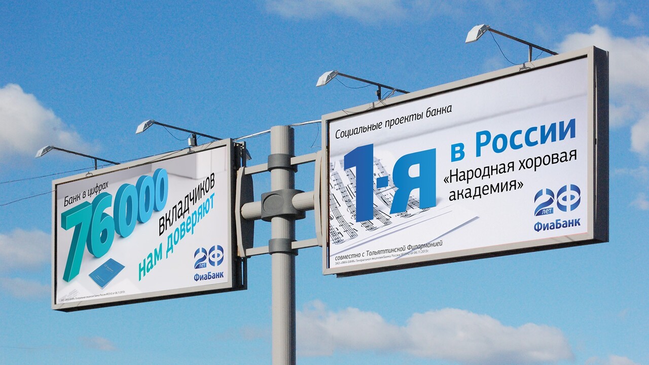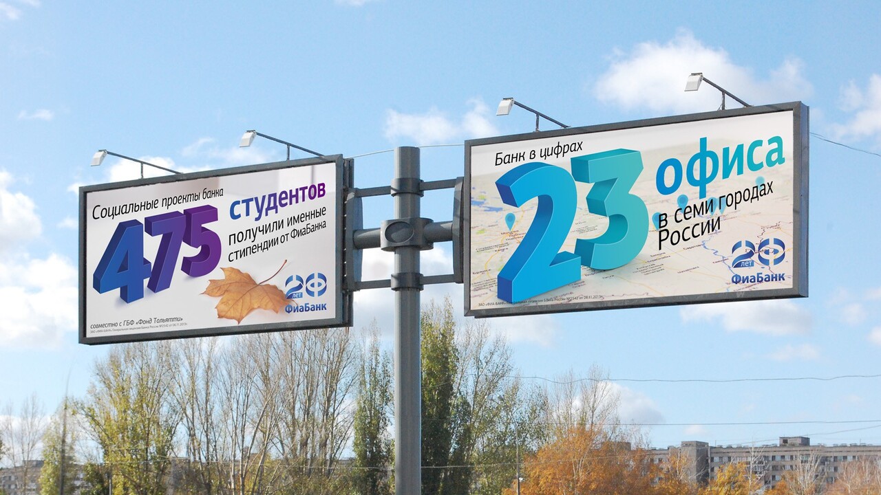 РЕШЕНИЕ: Каждый носитель рассказывает городу одну мини-историю а-ля «банк в числах». На первый план выходит числовое измерение успеха и краткое к нему описание. Число – смысловой и композиционный центр, оно приобретает лоск, текстуру и объем, а вся композицию за счет незначительных деталей каждый раз новое настроение и атмосферу. Свежая фирменная гамма раскладывается на несколько фирменных оттенков и цветовых акцентов, которые соединяются в стремительный уходящий за горизонт графический элемент. Новый вектор развития задан!