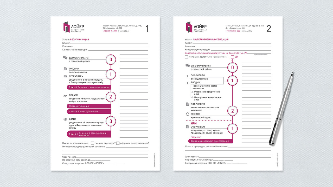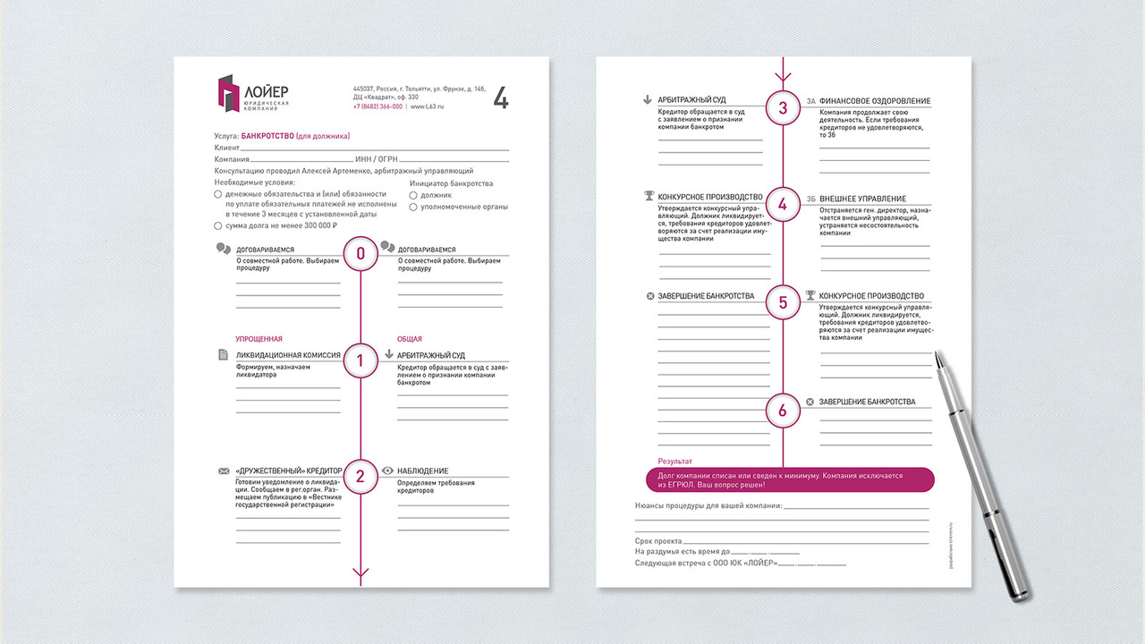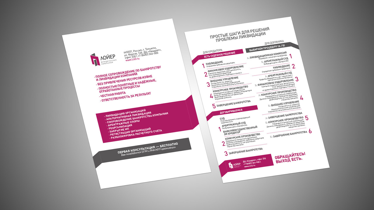 РЕШЕНИЕ: было предложено несколько рекламных концепций. Помимо этого созданы дополнительные инструменты, помогающие в работе: схемы ликвидации компании, бланки ответа на звонок, листовки, рассылка.
